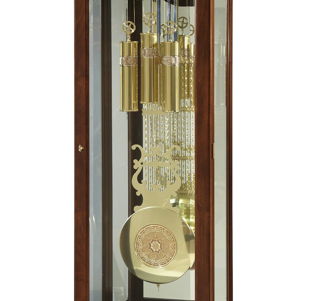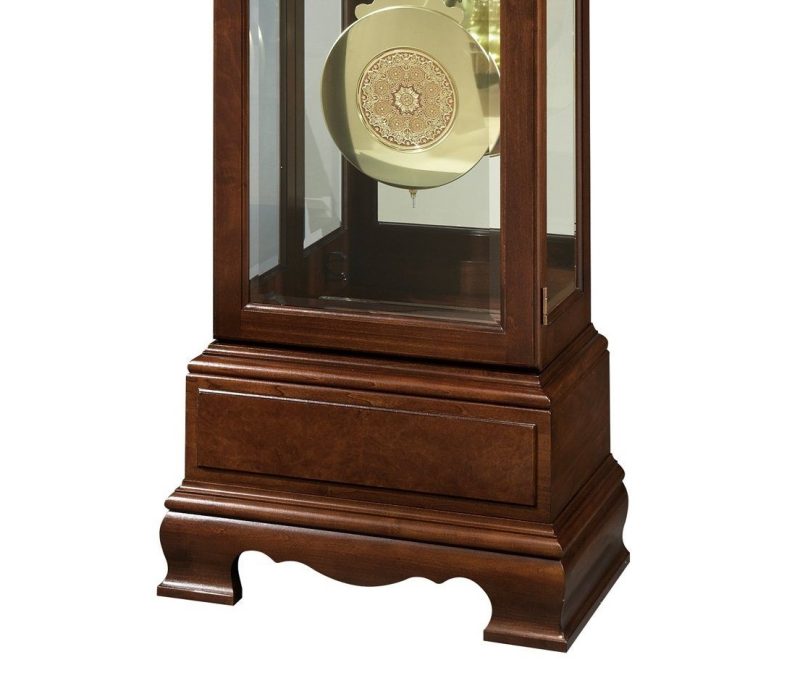 Đồng hồ được thiết kế thanh lịch với vỏ làm bằng gỗ Anh Đào (Cherry) có 3 mặt kính xung quanh để chiêm ngưỡng đầy đủ nét đẹp của đồng hồ. Đứng từ phía trước nhìn lại, mặt gỗ phía sau quả lắc được gắn tấm kính cho cảm giác không gian mở trong đồng hồ.