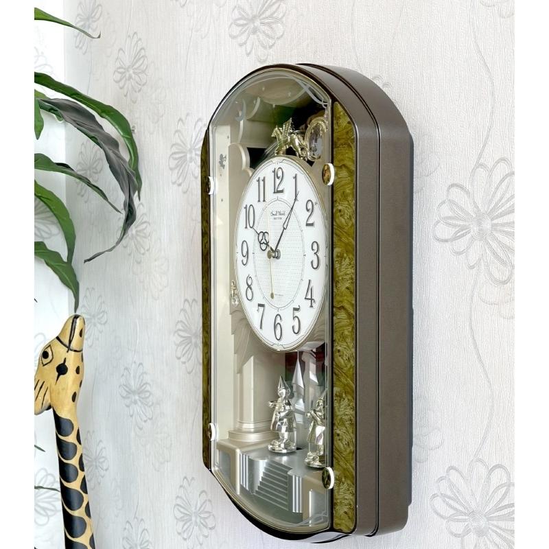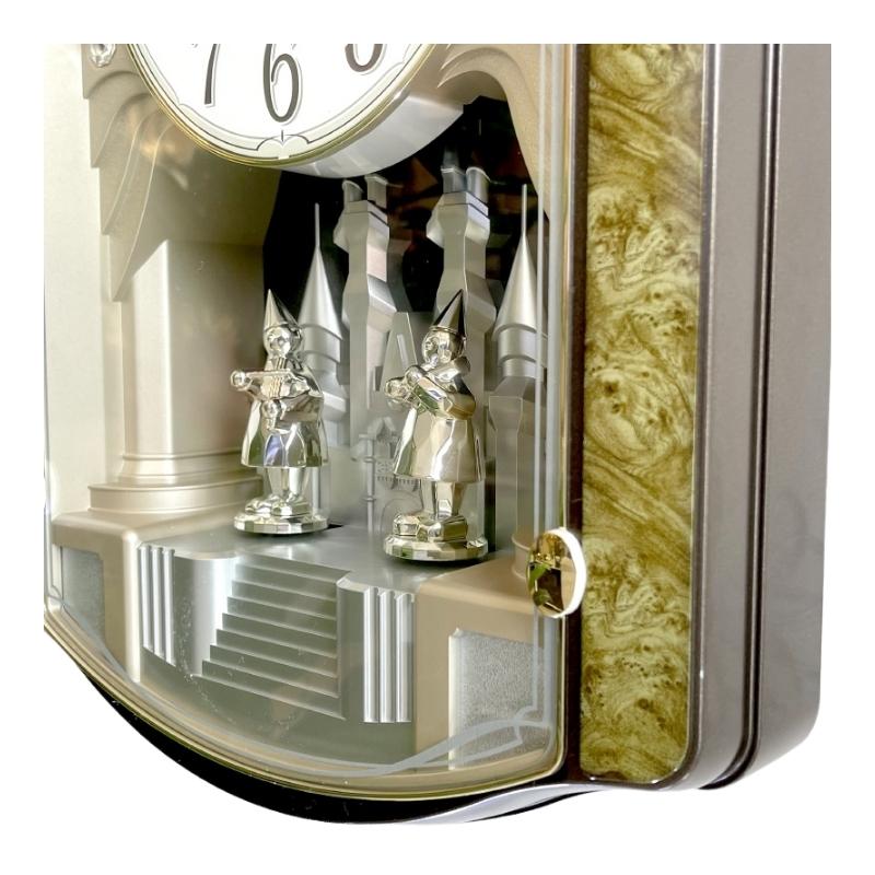 – Mỗi khi chuẩn giờ, đồng hồ sẽ dạo một bản nhạc nhẹ và các đèn trên mặt sẽ nhấp nháy theo. Đồng thời các chi tiết 2 người thổi kèn chuyển động vòng tròn theo tiếng nhạc.