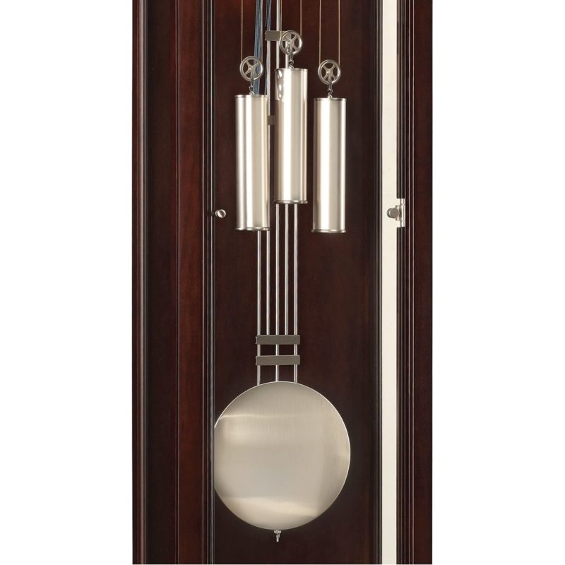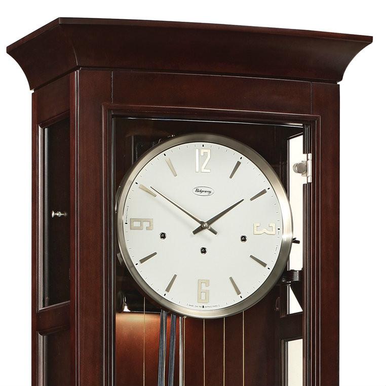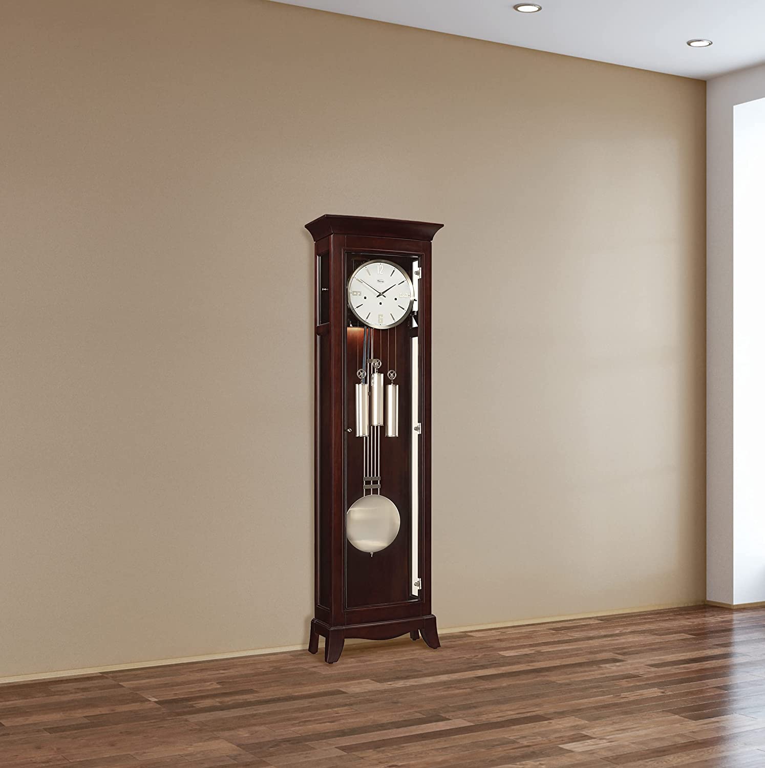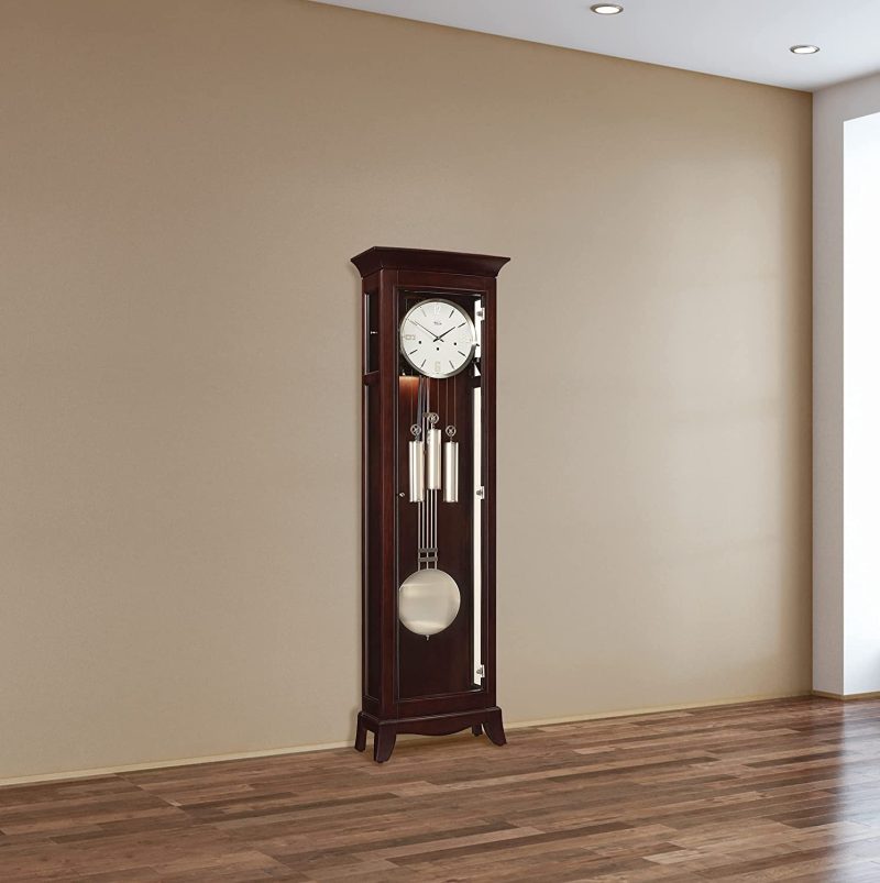 – Vỏ đồng hồ được làm từ gỗ nguyên khối được sơn màu nâu sậm, máy được làm từ đồng thau và các mặt số, quả lắc và tạ kéo được mạ niken để chống oxi hóa và luôn sáng bóng.